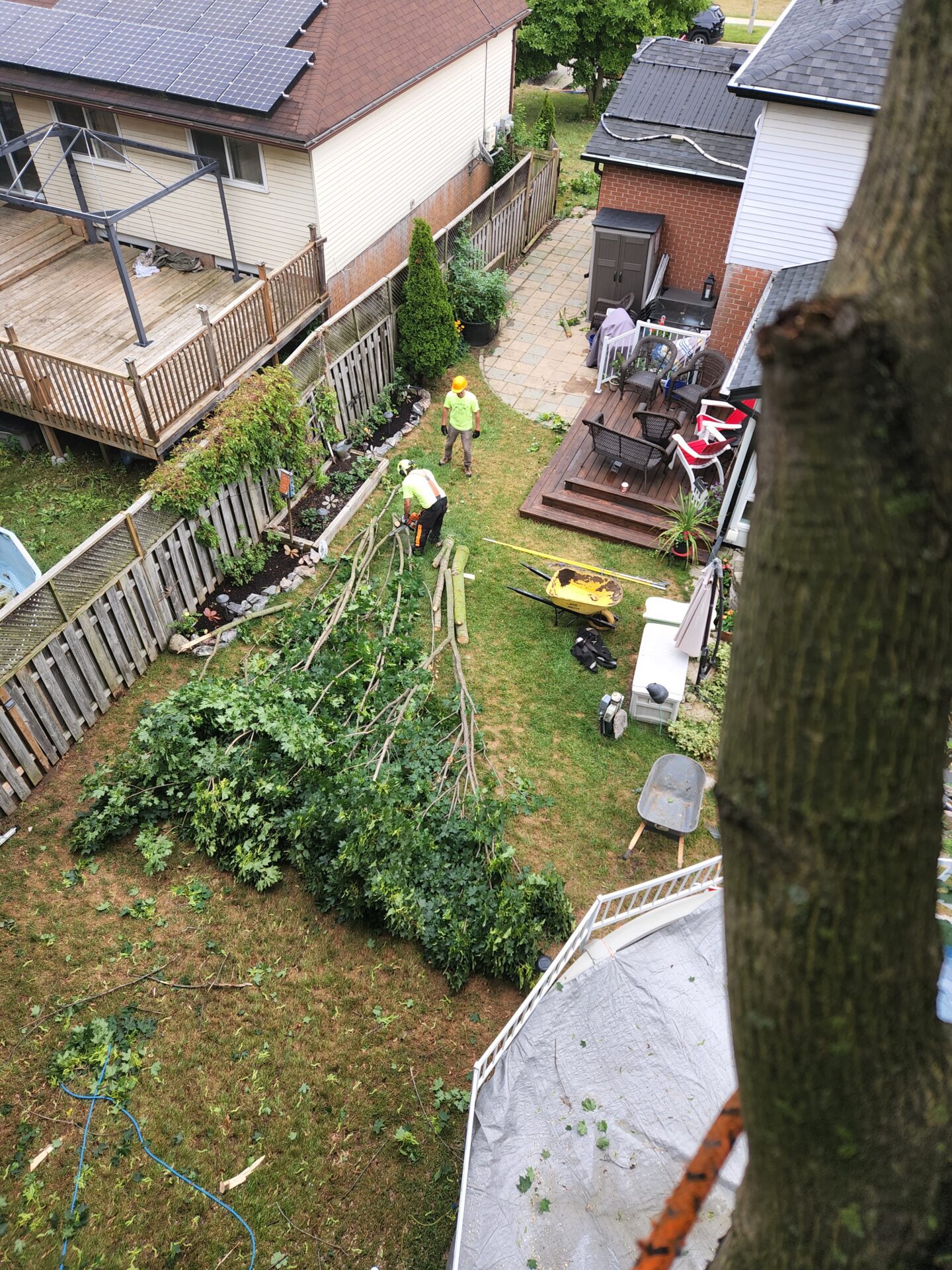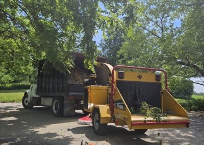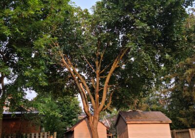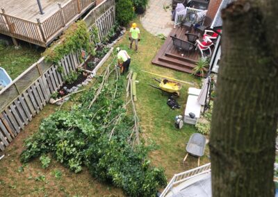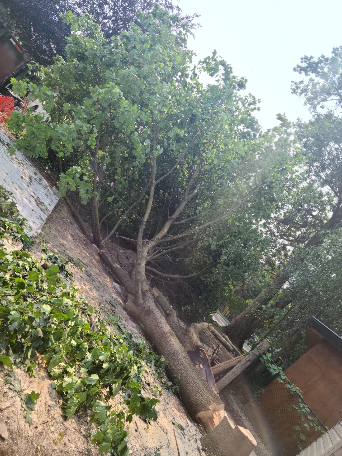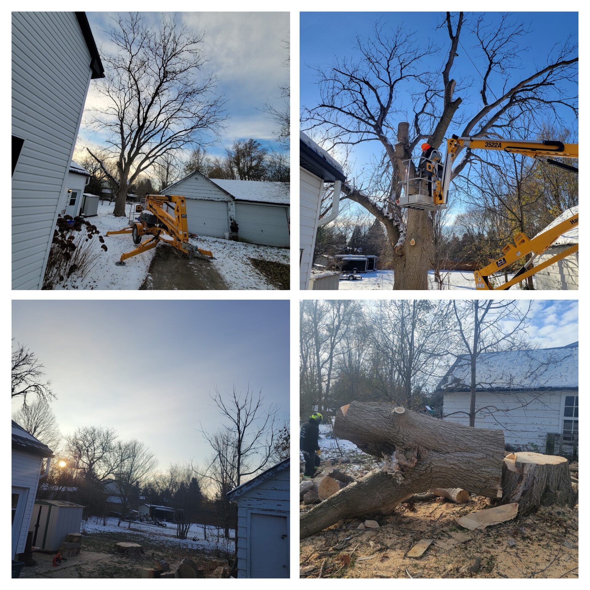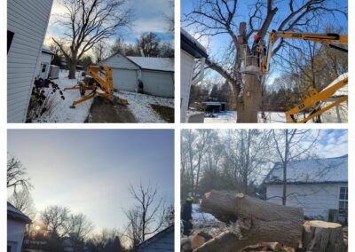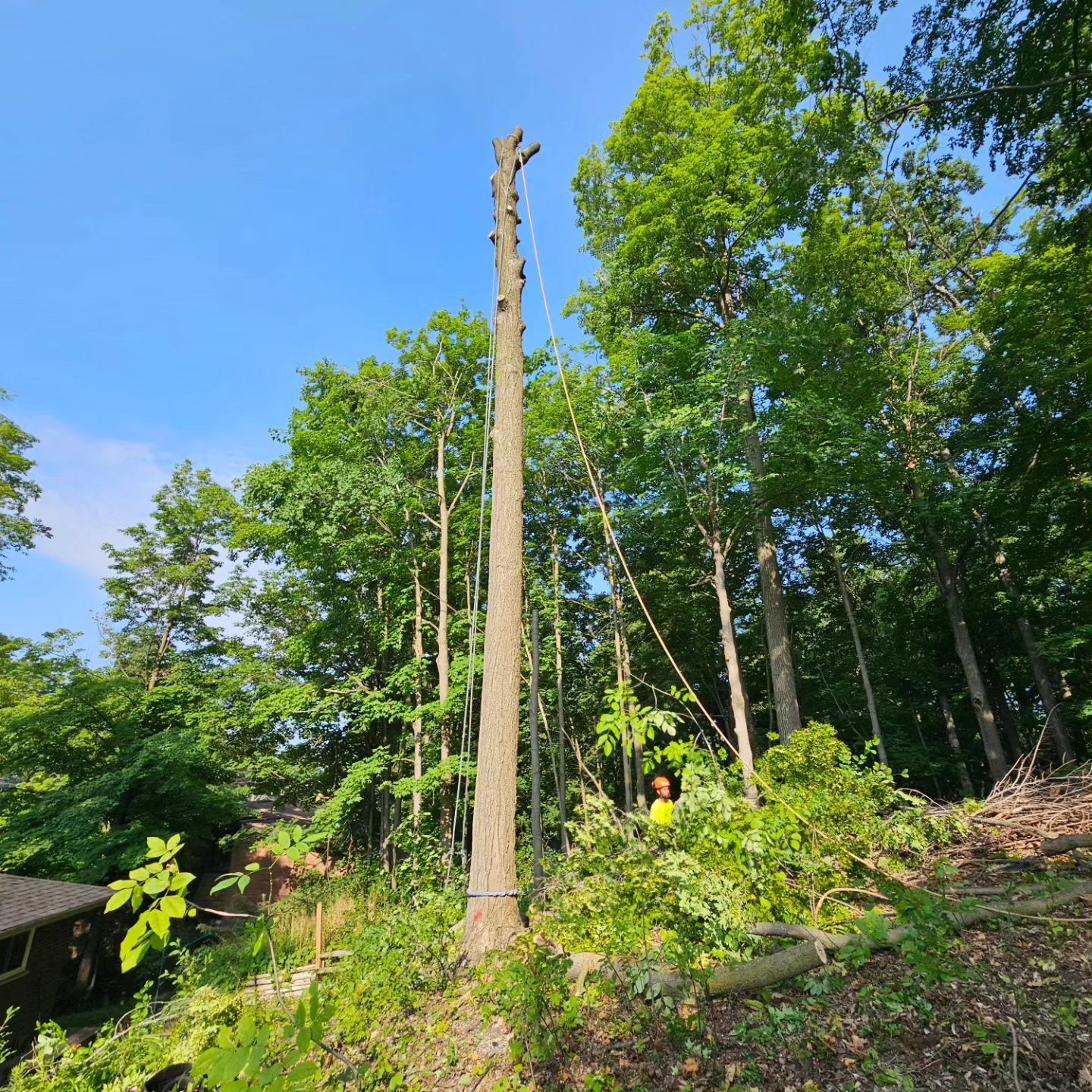 Cory climbed that tree, spurs on to the top as we all stood by totally amazed!! He started looping off branches with the trusty chainsaw and brought that broken tree down safely in no time at all. Half of that 80 foot tree had split and fallen barely missing the house after the big storm. Very efficient team! Great company !!